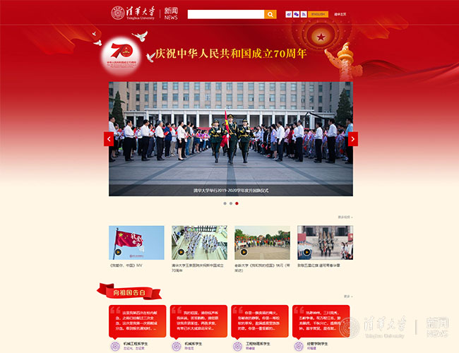其中,“头条新闻”集中呈现学校当前重要的庆祝活动和进展;“精彩视频”旨在以影像写真的生动形式实时展示丰富多彩的庆祝活动与清华人的爱国情、报国行;“向祖国告白”汇聚了广大师生们献给祖国的美好祝福和励志情怀;“庆祝活动”主要围绕各类庆祝活动进行图文并茂的报道;“特别策划”是对典型人物和事件策划组织的深度报道;“新清华特刊”是展示校报《新清华》16版国庆特刊的网络窗口;“精彩瞬间”涵盖了多姿多彩的图片新闻和视觉设计;“闪光时刻”重点发布校内新媒体平台多角度、立体化的一系列优质内容;“动态集锦”是校园各单位各方面国庆活动的最新消息大全;“媒体报道”则及时收录各家社会媒体近期关于清华成就风采和庆祝活动的报道。