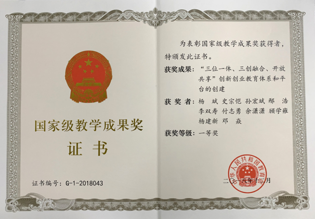 图为孙宏斌作为代表获颁的2018年国家级教学成果奖一等奖证书