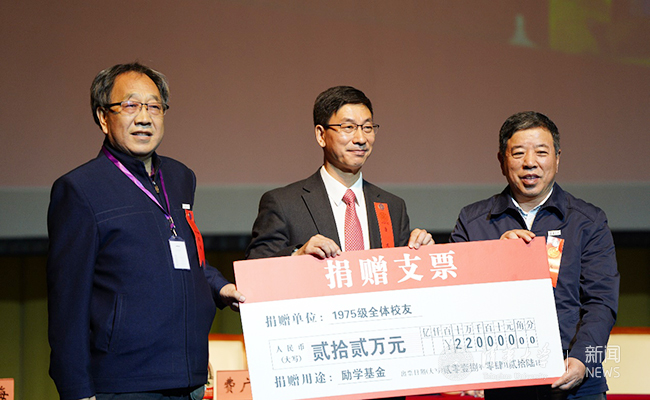 会上,1975级校友费广泰、林润还代表1975级全体校友向学校捐赠了励学基金,校友总会秘书长唐杰接收捐赠并宣读捐赠赠书。