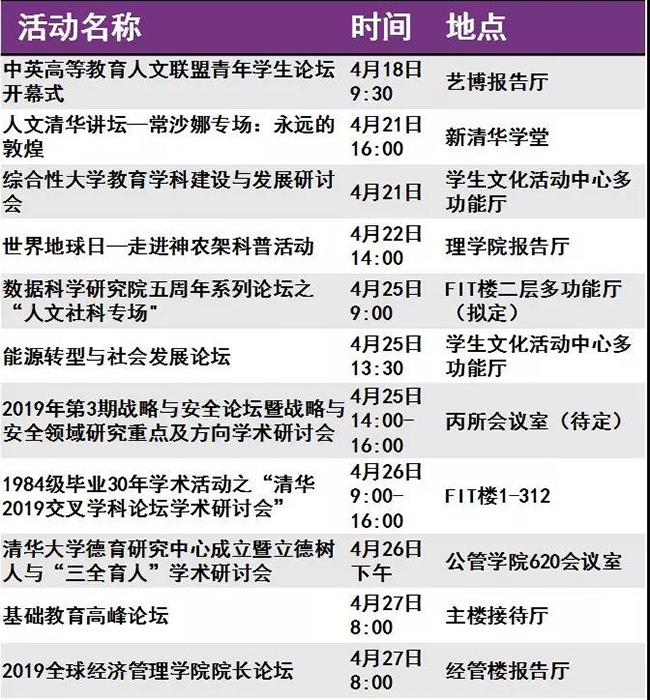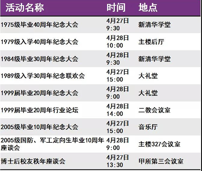 迎来“本命年”的清华呈现出一派生机勃勃的景象。等你回家的不仅是亲切的师长同窗、满园春意与点滴回忆,还有丰富多彩的校庆活动。秩年、综合、学术、体育、展览、开放、文艺、院系活动,8类活动先后呈现。