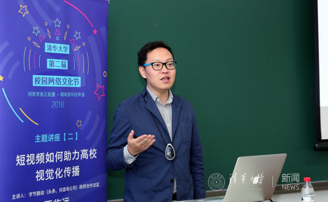 第二场讲座“短视频如何助力高校视觉化传播”邀请字节跳动公司政府合作总监贾临远为主讲嘉宾,结合高校、政务系统在抖音平台的短视频案例,深入讲解优质短视频的内容策划、生产制作与推广传播策略,并与现场师生就高校如何利用短视频做好视觉化传播进行了深入讨论。