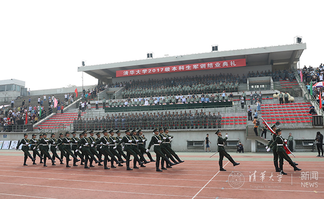 结业典礼从阅兵式和分列式开始。在军旗带领下,在雄壮的《分列式进行曲》的伴奏中,学生军训旅所属的三十二个连组成了十六个方队沿着东大操场红色跑道依次正步经过观礼台。整齐肃穆的方阵、气势磅礴的口号、刚劲有力的摆臂、步调一致的踢腿,举手投足间,既透出军人坚毅果敢的气质,又彰显着新一代清华学子昂扬向上的精神风貌,赢得了观礼台上各位首长和师生的阵阵掌声。
