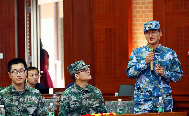 退伍老兵们也汇报了自己的军营收获。材料学院2014级本科生韩宝瑞曾参加在庆祝建军90周年阅兵,今年光荣退伍。他勉励新入伍同学,既要忘记自己是清华人,更要记住自己是清华人,在两年的军旅生涯中文明其精神、野蛮其体魄。