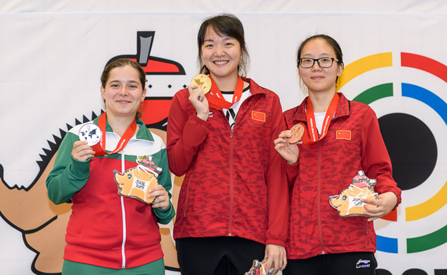 曹利佳(中)夺得第一届世界青年射击锦标赛女子手枪冠军。图片来源:国际射联官网