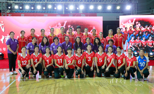 清华女排与中国女排姑娘合影留念。记者 张 宇 摄