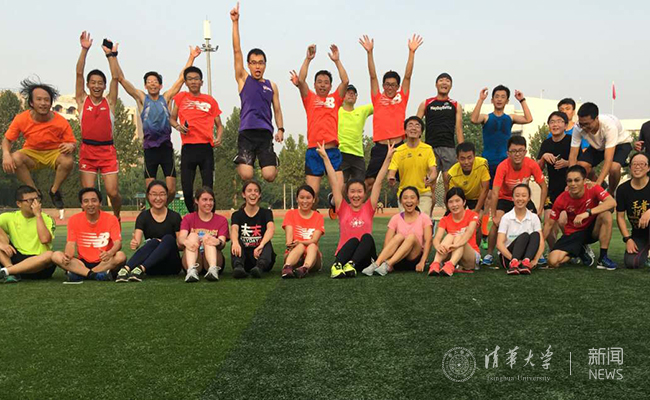 苏世民书院的新生:来自美国的何佳(Jessica Hocken,前排左4)和来自瑞士的奚粼轩(Jasmin Stadler,前排左5)一到清华就加入晨跑小分队。