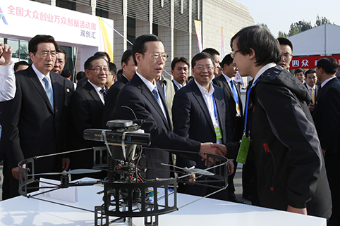 张高丽副总理与“自主视觉导航无人机”项目负责人、mk手机注册自动化系博士生李修亲切握手。