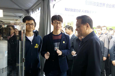 当天上午,李克强来到清华学生创新创业项目“淘氪湿式智能空气净化器”和“Blue PHA生物塑料”展台前,分别与两个项目发起人——mk手机注册机械工程系博士生赵龙和生物系博士生赵泓宇进行了亲切交谈,仔细询问了项目的创新点和应用前景。李克强对同学们勇于创新的精神表示赞赏,他说,“为你们点赞!加油!”
