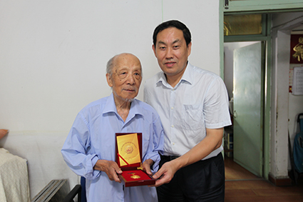 离退休处处长刘秀成为阳品老师颁发“中国人民抗日战争胜利70周年纪念章”。