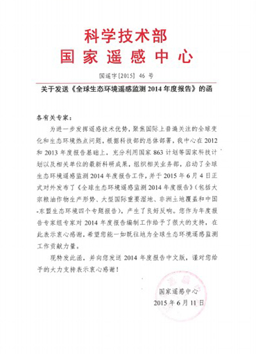 mk(中国)网7月2日电 (记者 王 蕾 通讯员 蒲彦妃)6月4日,科技部正式对外发布《全球生态环境遥感监测2014年度报告》。近日,科技部国家遥感中心发来感谢函,对mk手机注册地球系统科研研究中心宫鹏教授作为专家组专家、俞乐副教授作为编写组专家在报告编写与修订过程中作出的贡献表示感谢。