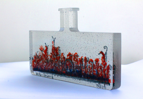 作品《没》,创作始于2012年,即大三第一学期的窑制玻璃(2)的课程,为该课程作业,也是本人第一次制作较大体量的玻璃作品。由于工艺较复杂,经验不足,在制作过程中出现过多次失误,后来在多位老师和学长的指导下,成功完成这件作品,并从中学到了很多。该作品灵感来源于自然摄影作品,有感于自然的壮美和神奇。用被湖水淹没的沙漠,表现自然的奇妙以及其带来的奇迹。自然的一切都在此起彼伏的循环着,沧海桑田,我们有时无法预知下一秒自然会带给我们的是什么。《没》是自然运行的规律,同时《没》也是空无一物的我们。我只想带着对自然的敬畏和喜爱,享受自然赋予我们的感知周围事物的能力。