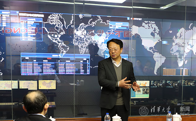在下一代互联网络运行演示中心,王希勤听取了信息化技术中心党委书记张小平关于信息化安全运行工作汇报和信息化技术中心副主任佟秋利关于信息化安全保障总体情况汇报,检查了学校信息系统、校园网络、核心机房等信息基础设施运行防护策略及监测监控情况。