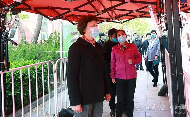 在附中西门,陈旭听取了校门防控情况介绍。为严格管控试开学后人员流动,附中在校门处设置了测温和人脸识别设备,并将学生进入校园的路线分成几路,尽量避免交叉和聚集。