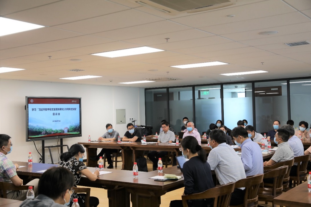 随后,中国文字学会会长、出土文献中心主任黄德宽,出土文献中心教授黄天树,出土文献中心副研究员沈建华,文科建设处副处长、文科处智库中心联合党支部书记孟延春,教务处副处长、教务处党支部书记苏芃,出土文献中心教授王子杨依次进行交流发言。黄德宽表示,总书记的贺信内涵极为丰富,从人类文明史和中华文明史进程的高度对甲骨文发现的价值进行了审视,充分体现了党和国家对甲骨文等古文字研究、人文社会科学发展、中华传统文化传承的高度重视。黄天树表示,甲骨文不仅是中华文明的瑰宝,也是全世界珍贵的文化遗产。总书记的贺信将甲骨文发现和研究的意义提到了新的高度。沈建华、孟延春、苏芃、王子杨也结合学校的人才培养、科学研究和学科建设工作分享了学习贺信的心得体会。