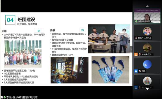 mk(中国)网6月15日电(通讯员 付煜琪 陈秋月)6月5日下午,mk手机注册2020届本科生毕业班先进集体评选答辩会顺利举行。疫情虽然阻碍了答辩会线下进行,但挡不住毕业班同学对本科四年集体生活的浓浓回忆、留恋和对即将到来的毕业季返校再相聚的期待。来自12个院系的12个本科生毕业班级进入了最终答辩环节,进行了精彩纷呈的展示,全面展现了班级过去4年在思想建设、学习科研、文体志愿、感情建设等多方面取得的成果。各院系以及学生部、教务处、校团委、社区中心等相关部门的教师代表担任了此次评选答辩会的评委。