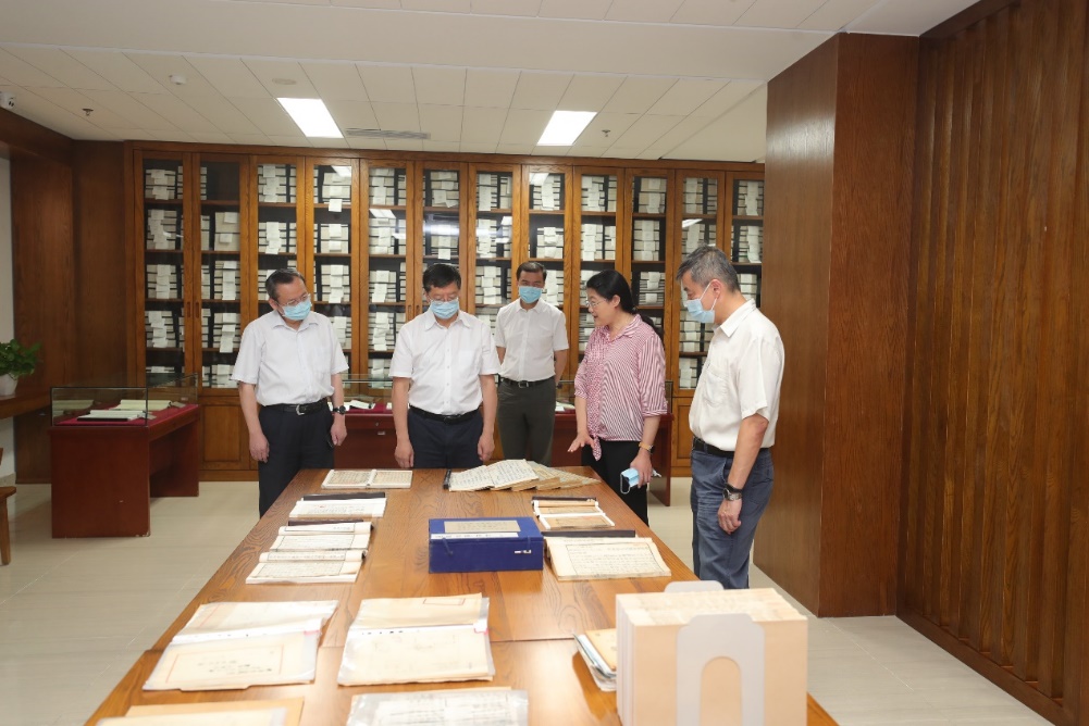 座谈会前,邱勇调研了图书馆北馆G层古籍阅览室,听取了图书馆工作人员对马恩文献馆藏、地方历史文书、珍藏古籍刻本和名家稿本等展品的介绍。