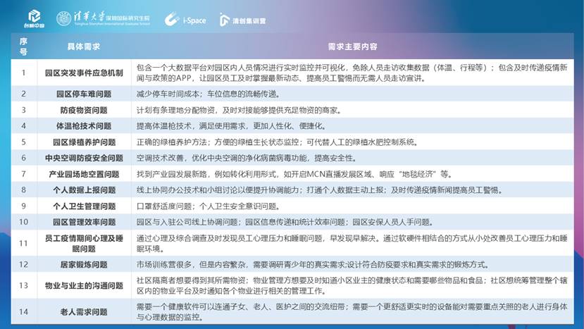 2020清创集训营毕业典礼之后,紧接着举行了清华i-Space创新挑战赛(抗疫防疫专场)启动仪式。该项赛事将成为继清创集训营之后的第二场联盟活动,旨在激发高校学生的社会责任感和创新创业思考,从抗疫防疫的一线实际需求切入,加强高校与社会之间产学研的深度融合。5月-7月为大赛的需求调研阶段,在此期间,清华i-Space在水木科创和深圳市绿色低碳科技促进会的大力支持下,联合20家机构单位合作,组织本届集训营营员开展了13场社会调研,发掘不同场景下的抗疫防疫需求。最终整理提炼出需求列表在大赛启动仪式上进行发布,包括园区突发事件应急机制、停车难、防疫物资调配、中央空调防疫安全、个人数据上报、居家锻炼、老人健康、疫情下的心理健康等10余个问题,将在后续的大赛环节中进一步得到落实解决。