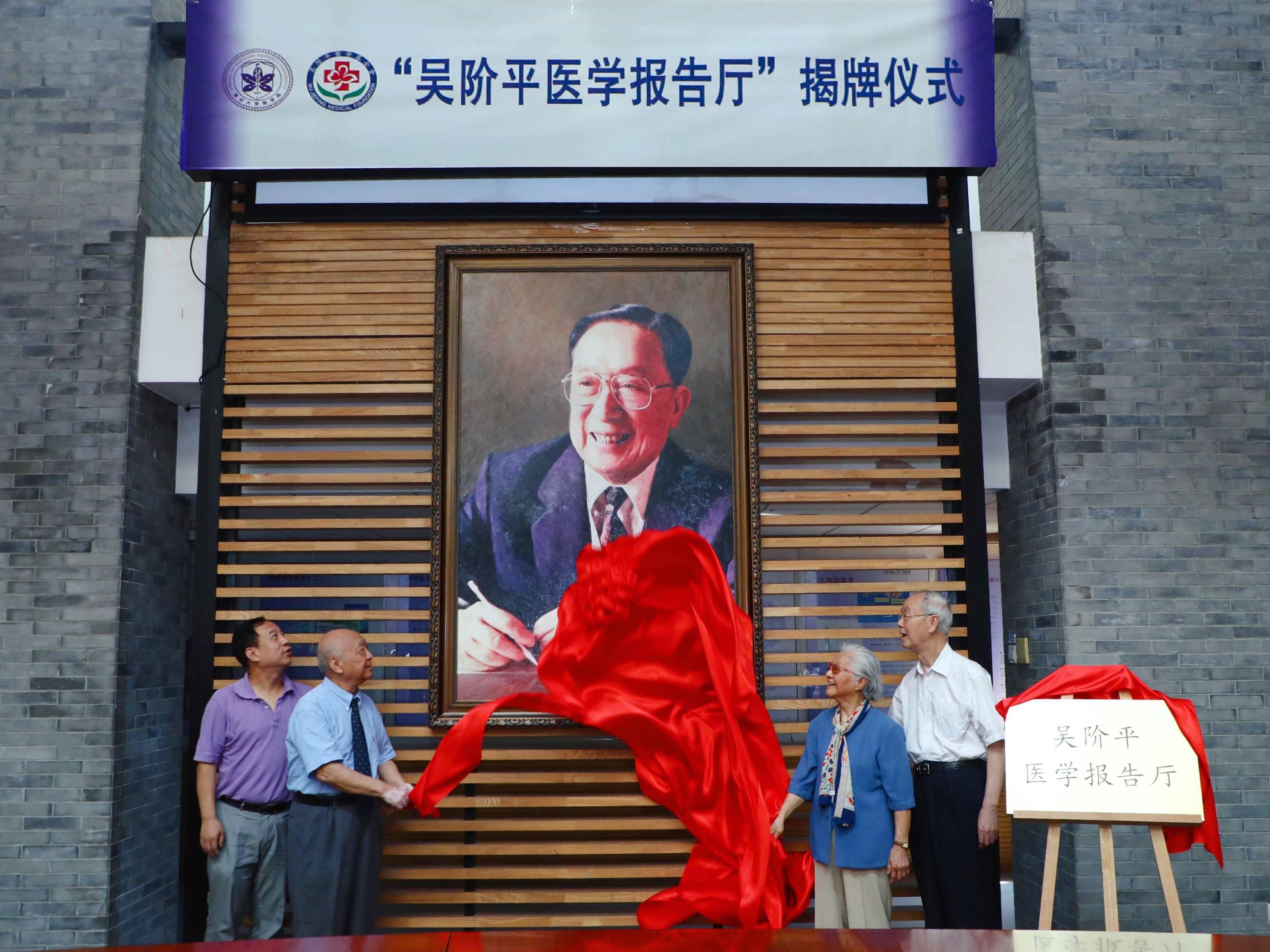 董晨、赵南明、高睿、肖梓仁(从左至右)为吴阶平院士画像及吴阶平医学报告厅揭幕