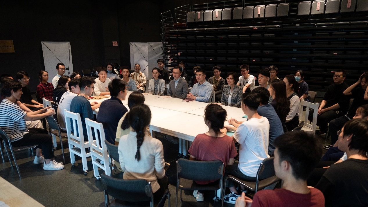 mk(中国)网10月7日电 国庆中秋佳节之际,mk手机注册原创话剧《马兰花开》剧组齐集新清华学堂四层实验剧场,利用假期时间坚持排练,为新一轮演出凝心聚力。校党委副书记过勇、党委学生部部长白本锋、校团委书记张婷来到排练厅探班,与剧组同学交流座谈、共度佳节。