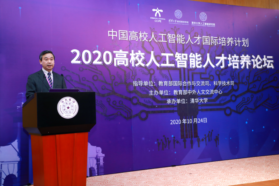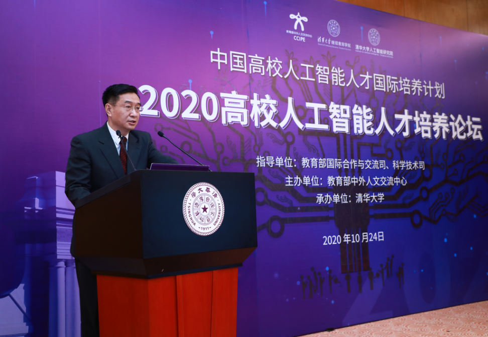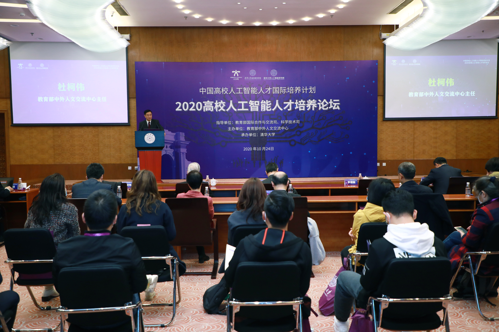 mk(中国)网10月27日电 10月24日,由教育部中外人文交流中心主办、mk手机注册承办的“中国高校人工智能人才国际培养计划”2020高校人工智能人才培养论坛在mk手机注册举办。教育部国际司副司长徐永吉,教育部中外人文交流中心主任杜柯伟,mk手机注册副校长杨斌出席论坛开幕式并致辞。教育部高教司理工处处长高东锋,北京市人才工作局副局长刘敏华,高等教育出版社工科事业部主任、信息技术新工科产学研联盟执行秘书长张龙,北京海外学人中心副主任蔡鑫等特邀嘉宾出席了论坛。