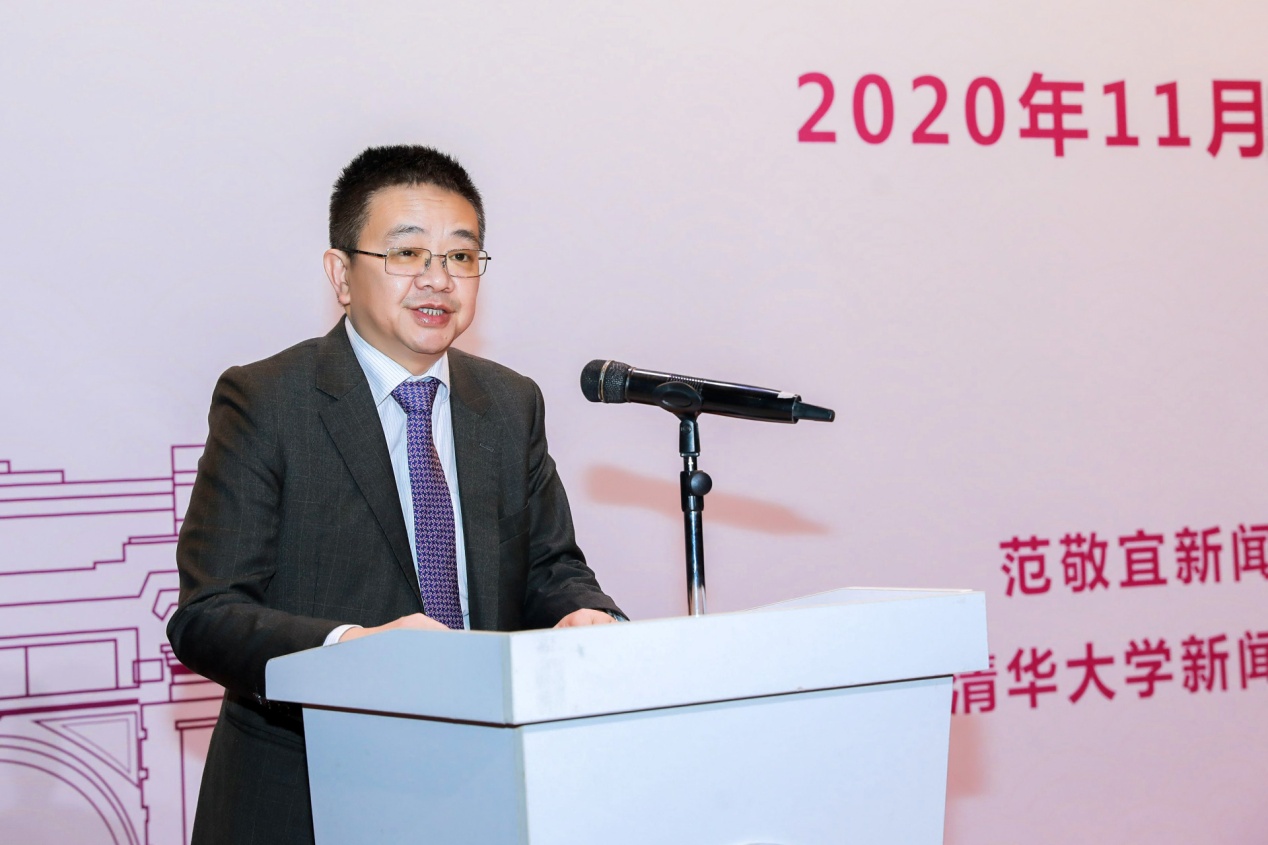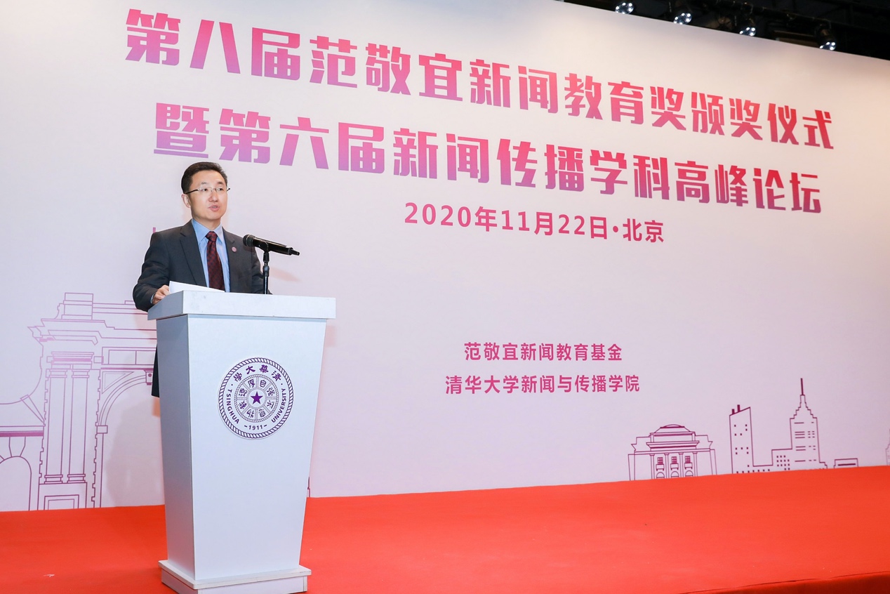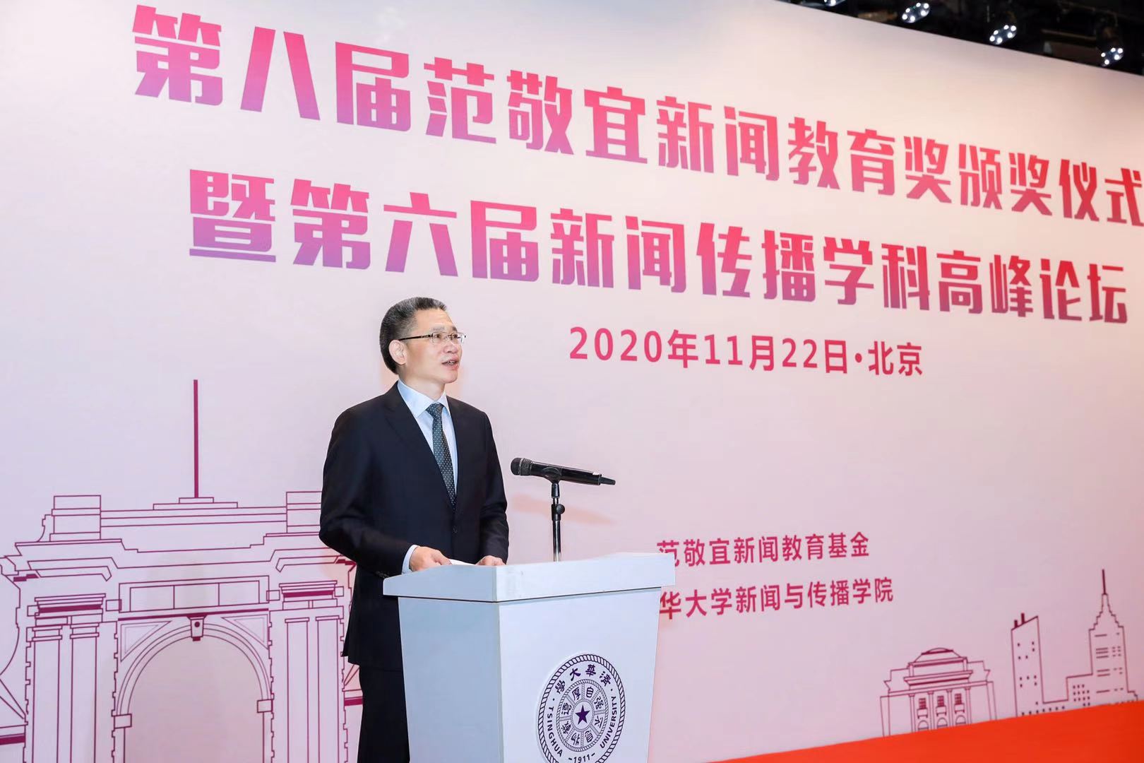 彭刚在致辞中指出,范敬宜新闻教育奖体现了我国新闻学界和业界对学子、良师、良友的期待和肯定。尤其在新冠肺炎疫情的特殊时期,这些优秀的专业人才彰显出新闻的力量。他表示,新的媒介环境和国际传播形势亟需更多优秀的新闻专业人才,打造优质的新闻产品。彭刚对同时召开的新闻传播学科高峰论坛表示祝贺,希望通过活动的开展,为支持新闻传播学学科建设贡献清华智慧,为讲好中国故事贡献清华力量。
