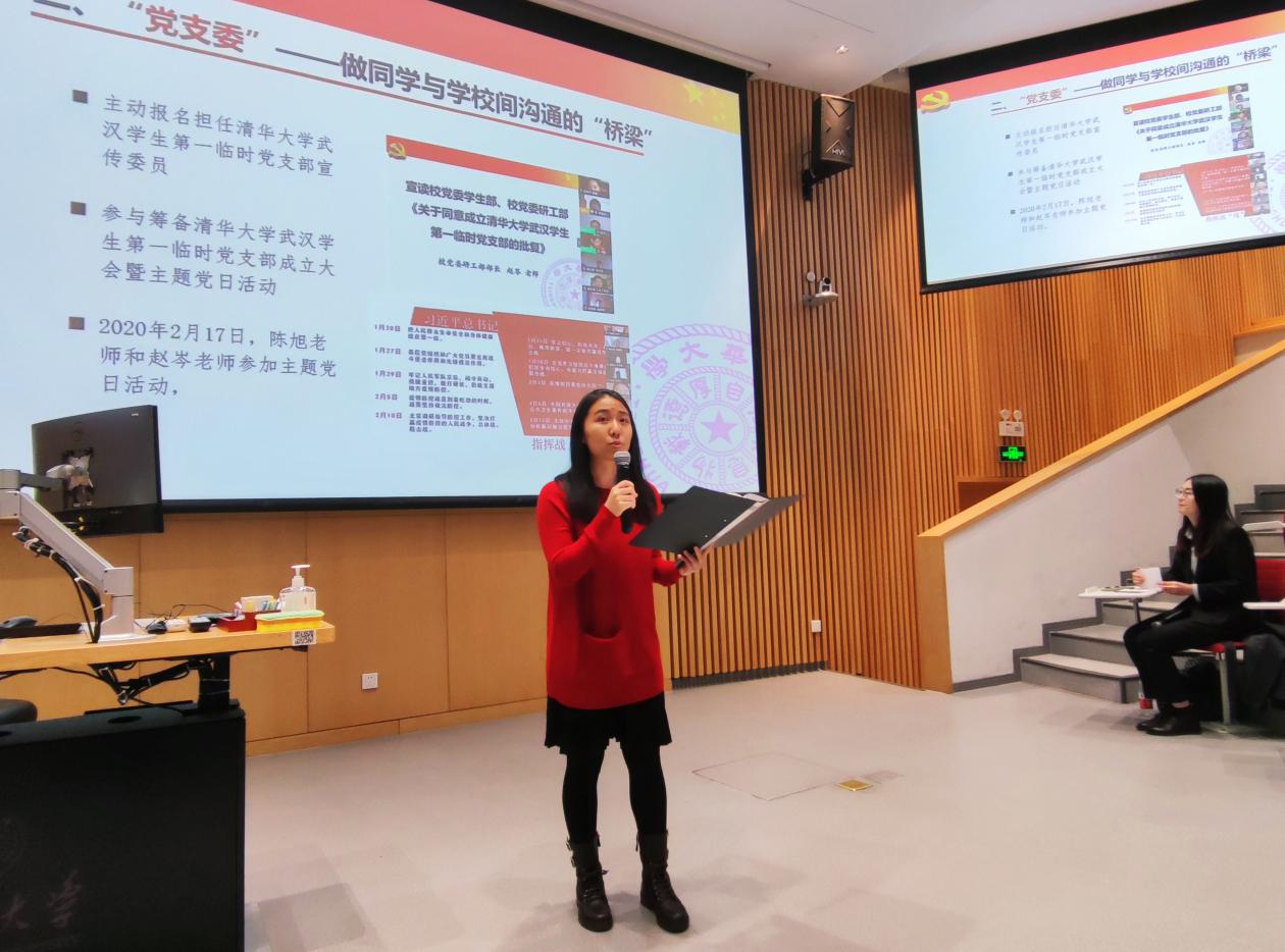 医学院2015级博士生单思思从疫苗研发入手向大家介绍了新冠肺炎防控攻关工作的科研历程。作为第一个报名参加新冠病毒科研攻关团队,自1月20日以来,她连续工作200余天,在科研战“疫”一线争分夺秒、攻坚克难,24小时连轴转地泡在实验室里,生产抗体、检测抗体功能、进行动物实验。3月2日,习近平总书记来学校考察,她作为团队代表为向总书记汇报演示了新冠抗体的酶联免疫吸附实验。在经历了无数次的失败后,她和团队成员已经解析了病毒与蛋白结合的关键结构、成功分离出200多株抗新冠病毒的单克隆抗体及其编码基因,进行了体内和体外的功能实验,目前正在进行临床试验。同时团队的腺病毒疫苗也进入公司生产阶段,接下来将进行临床试验。最后,单思思同学分享道:“我们作为研究生、作为学生党员,面对着时代的机遇与挑战,更要展示出我们作为清华人的使命担当,坚守科研一线,攀登科研高峰,以更多的科研成果守护人民群众的生命安全和身体健康”。