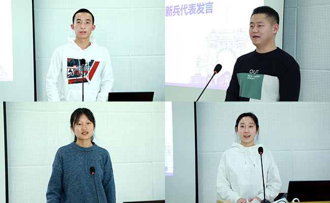 新兵代表讲述了自己参军入伍的初心和对军旅生涯的期待,尤其在听完各位老兵的经历后,都表示愿意到最艰苦的地方去,到祖国最需要的地方去。来自新雅书院的张美翰讲述了自己圆梦军旅、践行书院精神的心路历程;来自车辆与运载学院的侯宇峰表达了渴望在部队锤炼自己、保家卫国的决心;来自法学院的女兵李冰倩表示已经做好了从被他人保护到保护他人的准备,做好了奔赴一线保家卫国的准备;来自化学系的张旭讲述了自己多次应征入伍的曲折经历,表达了圆梦军旅的激动之情。