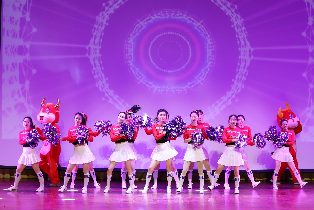 财务处的开场舞《牛转乾坤-加油啦啦操》拉开了整场晚会的帷幕。演员们拿着花球跟随欢快的音乐跃动,青春的活力洋溢在大礼堂的每个角落。