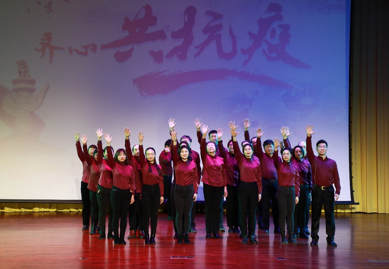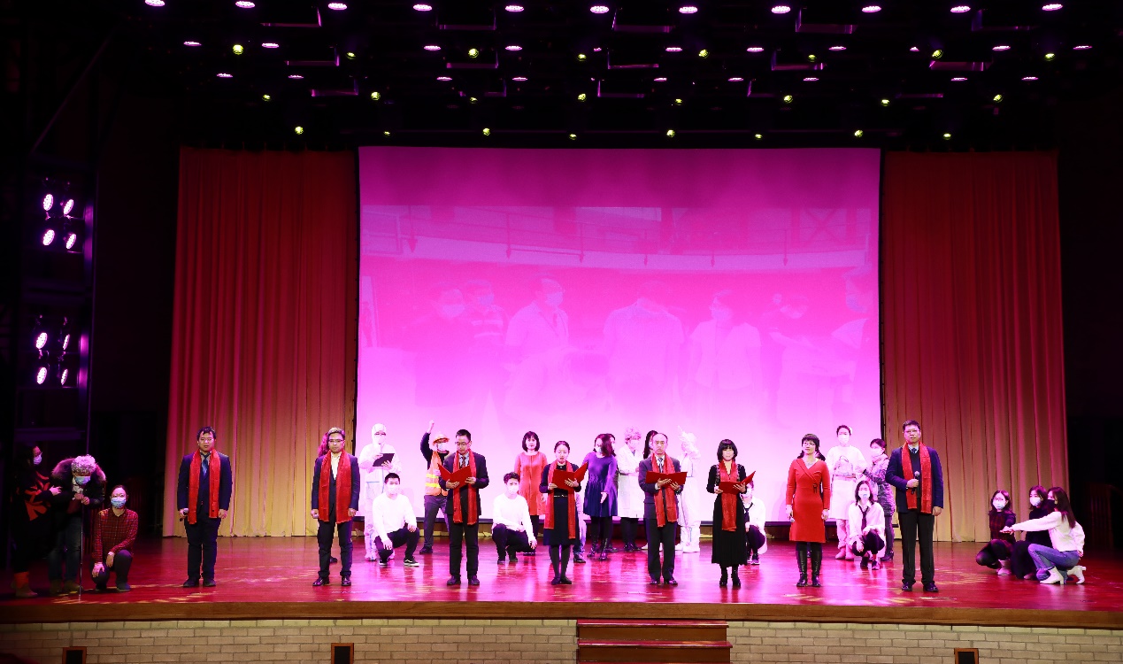第一篇章“齐心共抗疫”中,以人事处的歌舞和朗诵《拥抱美好的明天》开篇,保卫部的情景诗朗诵《清华有我,坚决打赢清华园保卫战》,校友办的朗诵表演《厚德载物天涯无界—清华校友总会的抗疫故事》讲述了过去一年全体清华人义无反顾、心手相连,齐心协力构筑起了清华的抗疫战线。离退休处、档案馆、校史研究室的天津快板与合唱《再一次出发》吹响了新的一年前进的号角,奋发的清华人将继续砥砺前行,在追梦的路上阔步向前。