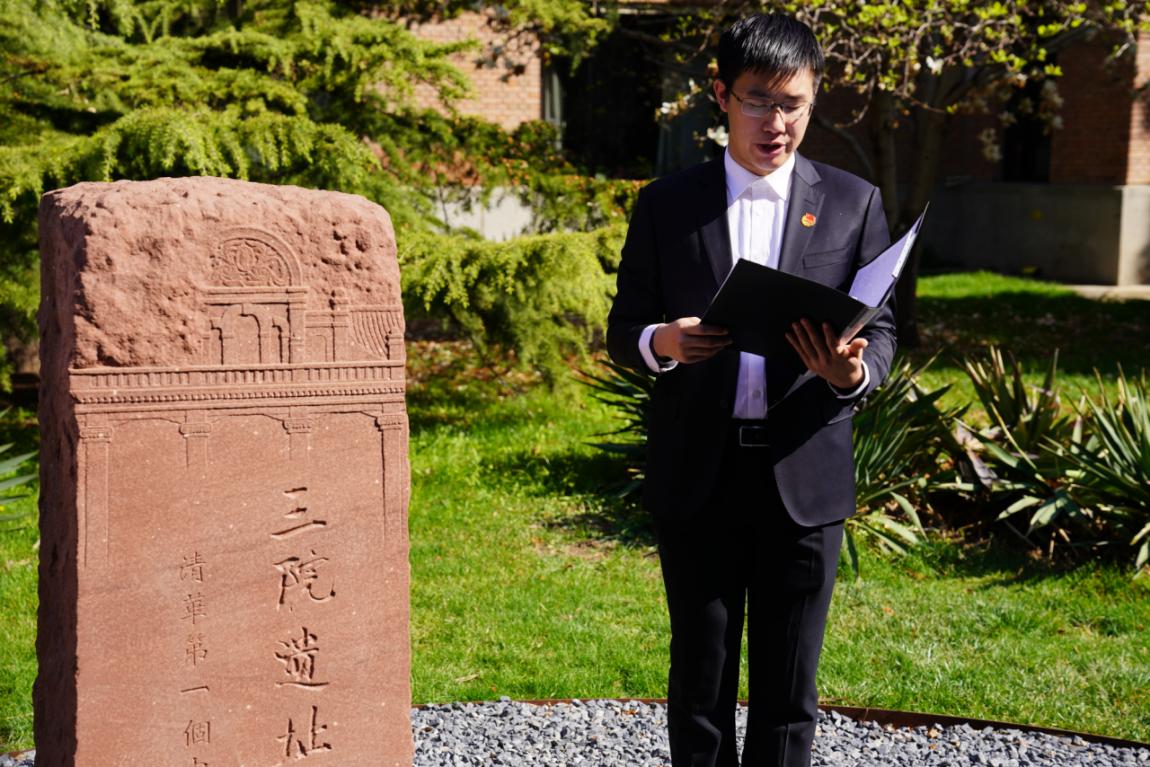 在“三院遗址·清华第一个中共支部诞生地”纪念碑前,黄京磊阐述了“三院遗址”的红色背景、历史变迁与特殊意义,追溯清华第一个党支部的成立和早期党组织的光荣历史。他表示,三院是清华学子心中的一块丰碑,清华党员受三院精神感召、身体力行地书写着牺牲自我、服务社会的故事,党的光辉将永远照耀清华学子的前进道路。
