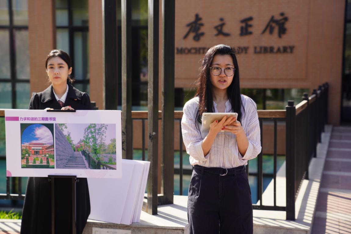 在李文正图书馆前,涂晗详细讲述了清华图书馆在亨利•墨菲、杨廷宝和关肇邺三代建筑师设计指导下的建设历史,回顾了杨绛、彭桓武、钱钟书等历代清华学子行健不息、追求卓越的奋斗故事。她表示清华图书馆见证着清华精神、彰显着自强底色,自强的清华人必将矢志上下求索,在爱国奉献中砥砺奋进。