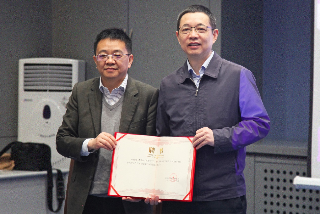 教育研究院“职业教育信息化研究中心”成立仪式上,彭刚向学术委员会委员颁发聘书。教育部教育信息化委员会副主任、西安电子科技大学校长杨宗凯教授受聘为学术委员会主任,国家教育行政学院职业教育研究中心主任邢晖教授、江南大学教育学院前院长陈明选教授受聘为学术委员会副主任,山东大学信息化办公室主任葛连升教授、北京师范大学人工智能学院宋继华教授、广西开放大学校长王兴辉教授、美国内华达大学雷诺分校刘乐频教授、北京大学教育学院贾积有教授、广东工贸职业学院院长何汉武教授、mk手机注册基础工业训练中心主任李双寿教授受聘为学术委员会委员。