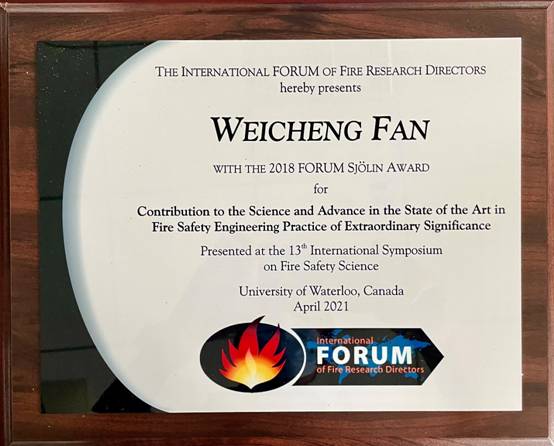 斯约林奖旨在奖励全球高校、科研院所始终致力于火灾安全科学理论研究和技术创新并取得重大科研成果的学者,每年一次仅评选出一位,并于三年一届的国际火灾安全科学大会上颁发,此次颁发的是2018-2020年度奖项。