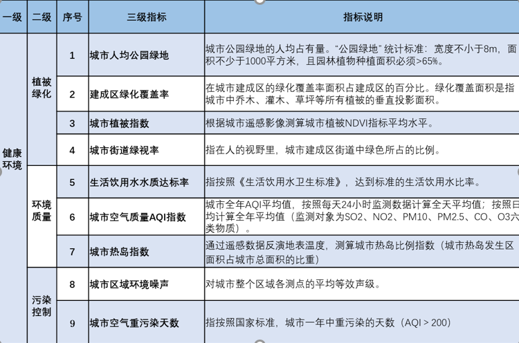 “清华城市健康环境指数”还构建了一套全面量化的规范性指标体系,涵盖三个二级指标和九个三级指标。其中,“植被绿化”板块设计了城市人均公园绿地、建成区绿化覆盖率、城市植被指数、城市街道绿视率等三级指标,从城市三维空间到居民直接感受,客观反映绿色资源的建设效果;“环境质量”领域立足空气、水、温度等健康影响要素,选取了生活饮用水水质达标率、城市空气质量指数(AQI)、城市热岛指数等三级指标;“污染控制”方面以人体生理和心理健康为考量因素,设立了城市区域环境噪声、城市空气重污染天数等三级指标。