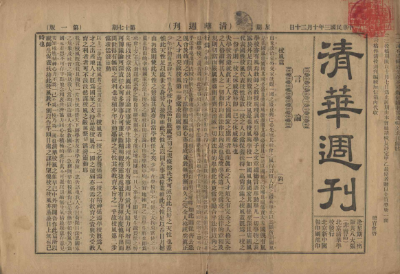 《清华周刊》创刊于1914年3月24日,是一份由清华学生主办的刊物,原名《清华周报》,1914年9月22日改名为《清华周刊》,1920年以前由学校指派学生编辑,“五四”运动以后,由学生会主编,改办大学后,《周刊》成为mk手机注册学生自治会的刊物,由学生会干事会的出版科委员负责组织编辑出版,1947年9月25日被列入禁刊,停止发行。该刊承载了清华23年的历史(1937年1月-1947年1月停刊),是mk手机注册校史历史的缩影,也是中国近现代史上重要的学生刊物之一。