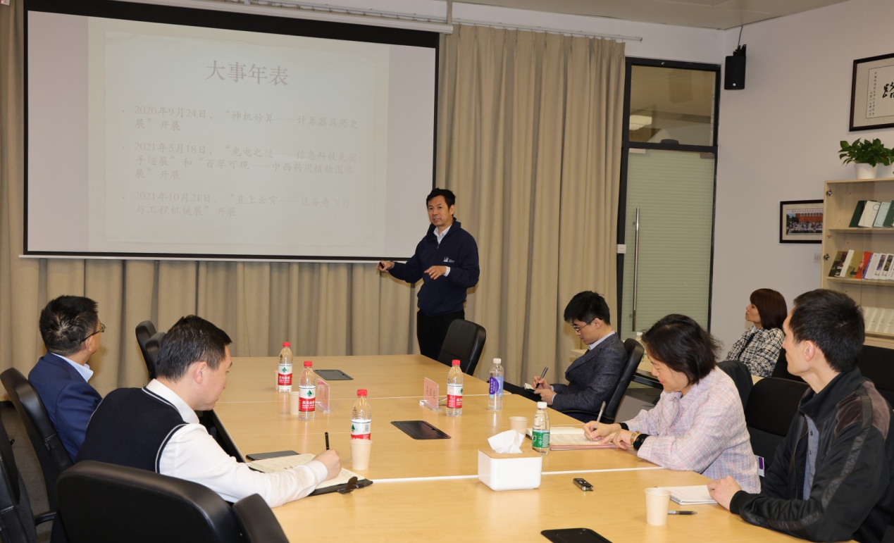 科博馆馆长吴国盛汇报了科博馆筹建的历史与现状、理念和目标。吴国盛表示,科博馆将推进清华科技史学科的发展,丰富清华校园文化生活,提升清华师生科学素养。
