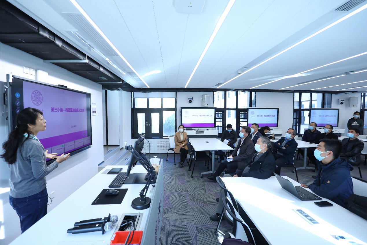 巡回指导组一行走进三教讨论室,信息化技术中心教师演示了多媒体设备使用方法,并汇报了学校信息化教学环境改造情况及融合式教学设计思路。程天权表示,三教公共空间的设计极大地提高了空间利用效率,便于师生随时开展研讨交流;要利用好教室的信息化技术,面向教师广泛开展培训指导,同时也要做好教室的管理维护工作。