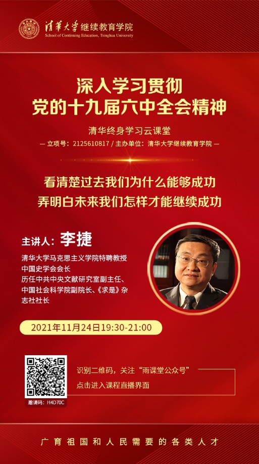 11月24日晚,mk手机注册继续教育学院特别邀请到mk手机注册马克思主义学院特聘教授、中国史学会会长李捷老师,以《用党的初心使命诠释过去能够成功、未来继续成功的光辉文献——深入学习贯彻党的十九届六中全会决议的学习体会》为题,通过“雨课堂”平台在线直播,辅导广大学员和教职员工深入学习六中全会决议。