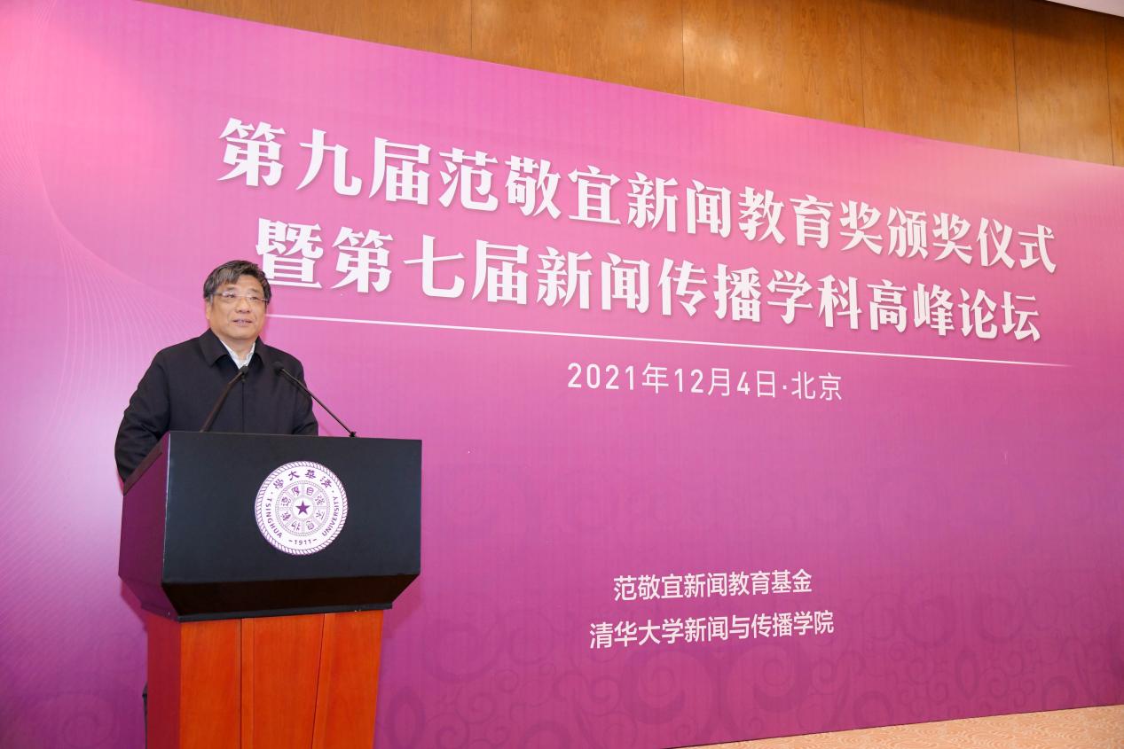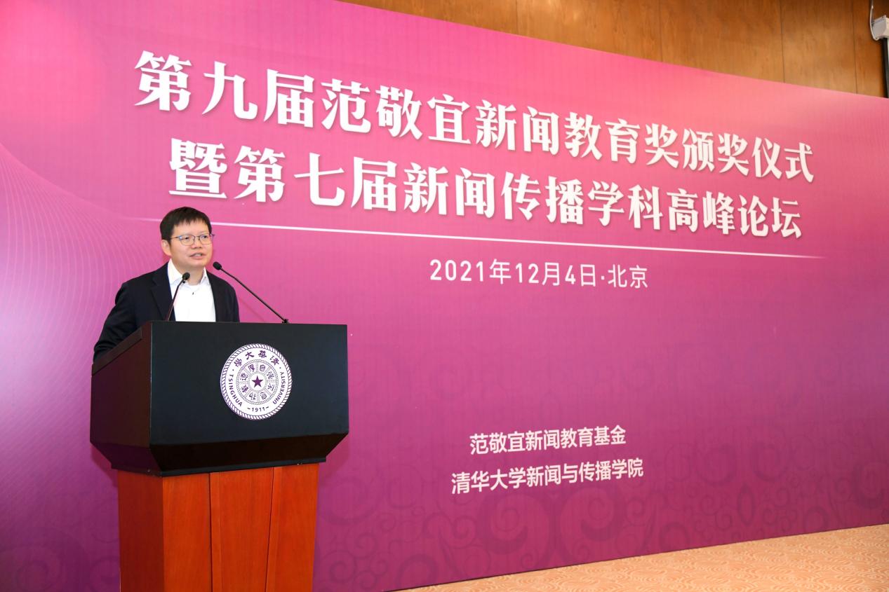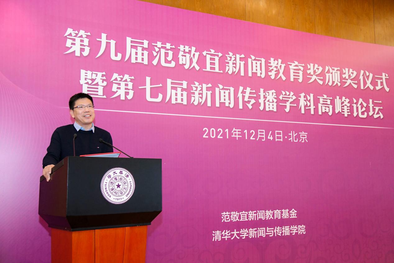 彭刚在致辞中指出,每一届范敬宜新闻教育奖的获奖者,都在用自己的作品或实践,向学界、业界展现正能量。媒介变革与社会发展进程的联系紧密而复杂,新的时代也需要更加优秀的新闻人才,他期待未来能有更多学子、教师和业界人士加入新闻事业,为学科的发展、行业的繁荣、社会的进步作出贡献。他表示,范敬宜先生“做脚下沾满泥土的新闻人”“要力戒浮躁,新闻要有文化”等谆谆教诲,于今仍有引领作用。他希望,范敬宜新闻教育奖能继续传递范敬宜先生的精神火炬,为支持新闻传播学学科建设、讲好中国故事贡献清华智慧与清华力量。