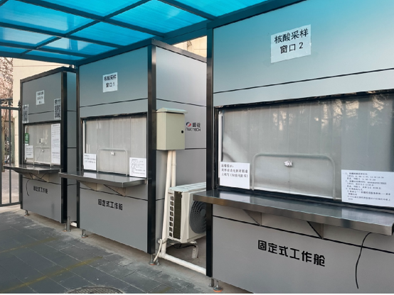 建立固定式核酸采样工作舱,完善核酸检测信息平台,主要针对普通人群进行采样,避免与病人有交叉接触,实现了师生核酸检测从挂号、缴费、条码打印、采样的一站式服务,方便快捷。