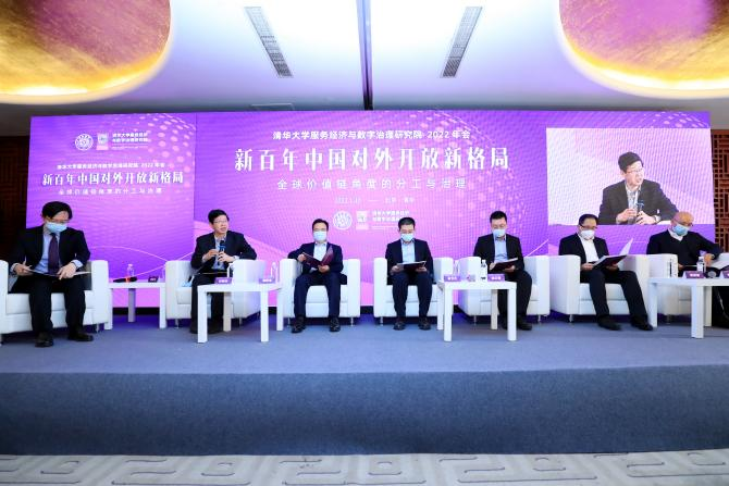 高宇宁主持圆桌论坛环节。商务部世界贸易组织司原司长洪晓东、商务部国际贸易经济合作研究院副院长崔卫杰、对外经济贸易大学中国WTO研究院院长屠新泉、对外经济贸易大学全球价值链研究院常务副院长殷晓鹏、中国社会科学院经济研究所研究员倪红福、中国社会科学院世界经济与政治研究所研究员刘仕国围绕数字贸易规则、对外开放特征、开放形势、价值链趋势等分享观点。