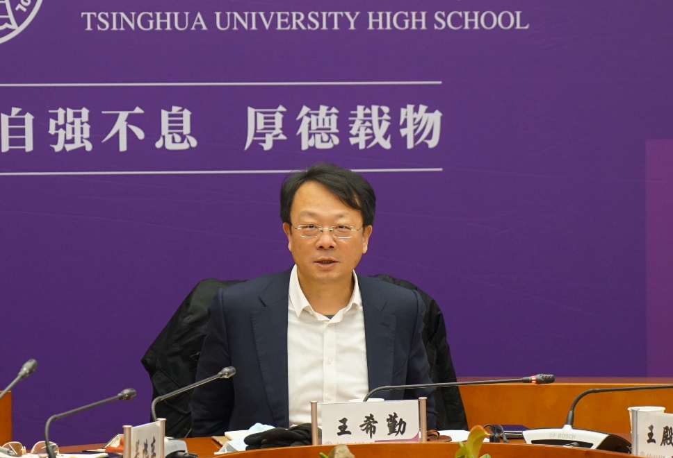 王希勤在听取了清华附中相关负责人的汇报后作了总结讲话。他对附中取得的办学成绩和丰硕的办学成果表示赞赏,对附中在大学人才队伍建设方面作出的贡献表示认可,对附中在基础教育领域发挥的作用表示肯定。针对附中迫切需要大学给予支持的问题,王希勤逐一进行了回应。他表示,会后将协调学校各部门商议解决,为附中发展提供切实的支持保障。王希勤希望附中明确以支撑大学发展为自身定位,科学规划、合理布局,不断提升教育教学质量,实现长远稳定发展,办好人民满意的教育。