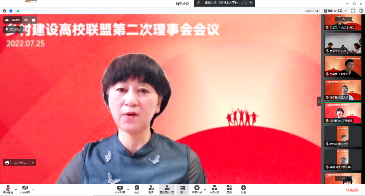 北京林业大学校党委副书记孙信丽发言表示,建立加强模式创新,在联盟平台上推动强强联合,互助共赢。建议加强校地对接,摸清乡村建设所急所需,围绕乡村建设实际出发,有针对性地提供支持和帮扶。建议联盟加强交流展示,及时总结好经验、好做法,不断提高乡村大课堂的育人作用,引导学生把个人成长融入乡村振兴事业,成为可堪重任的时代新人。