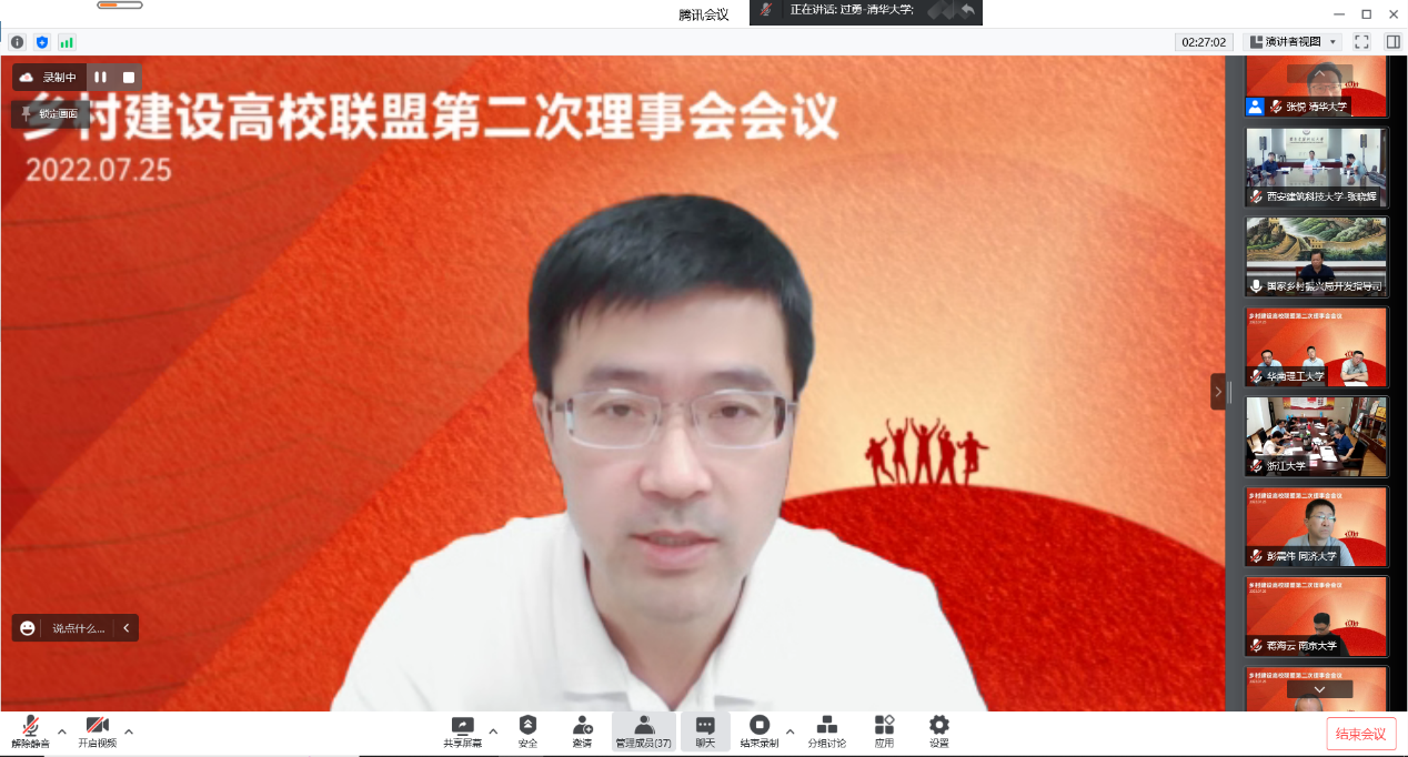 过勇在讲话中表示,作为国内首个乡村建设领域的高校联盟组织,契合了全面推进乡村振兴战略新阶段的新要求,也承载了实施乡村建设行动的历史任务。随着联盟成员单位规模扩大,更加需要各联盟理事同心协力,积极发挥桥梁、纽带作用,共同搭建好联盟这个汇聚高校力量、助力乡村建设的协同平台,落实服务国家乡村决策、服务乡村建设行动、服务乡村现代化发展的三个联盟工作目标。过勇强调联盟要进一步发挥好纽带作用,努力做好三个联合:一是加强“校校联合”,既充分发挥各个高校现有优势,又服务于高校立德树人的初心。二是加强“校地联合”,以“百校联百县兴千村”行动为抓手,把现有的方案与高校在脱贫攻坚阶段的服务架构相结合。三是加强“内外联合”,以联盟为载体,整合各方面资源,加强模式创新。期待联盟能扎实开展工作,为全面实施乡村振兴战略作出新的贡献,以实际行动和优异成绩迎接党的二十大胜利召开。