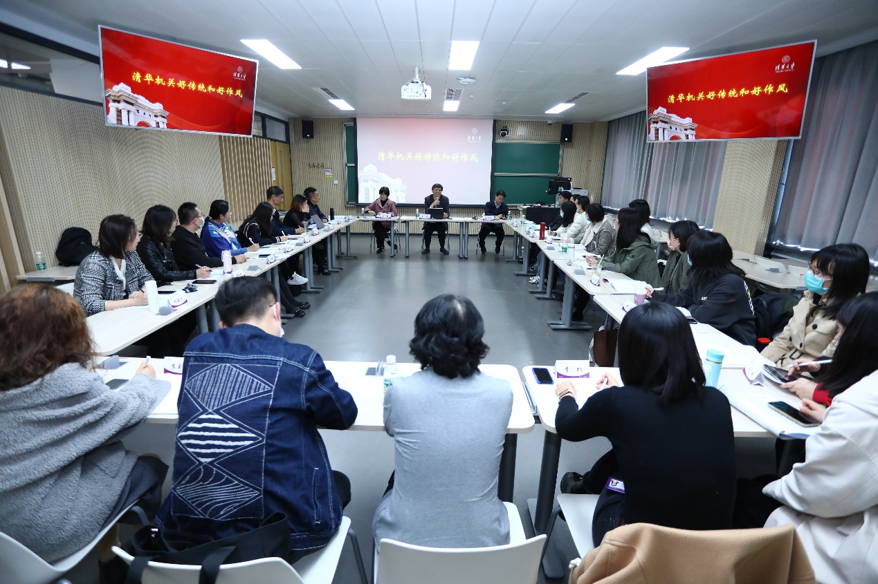 在交流总结环节,校务委员会副主任、校工会主席王岩应邀作“清华校机关好传统和好作风”主题报告,结合鲜活生动的故事从“坚定正确的政治方向”“自强不息的奋斗精神”“朴素务实的工作作风”“追求卓越的工作态度”“厚德载物的处世之道”“团结互助的同志关系”六个维度勉励大家作为清华人要胸怀大局、乐于奉献、勇于担当、奋力拼搏。欧阳沁主持了交流总结环节,并强调清华机关人要不断强化“荣誉感”“使命感”和“紧迫感”,深刻领悟党和国家对清华寄予的殷切期望,以时不我待、只争朝夕的精神勤勉工作、开拓进取,与学校同发展、共成长。