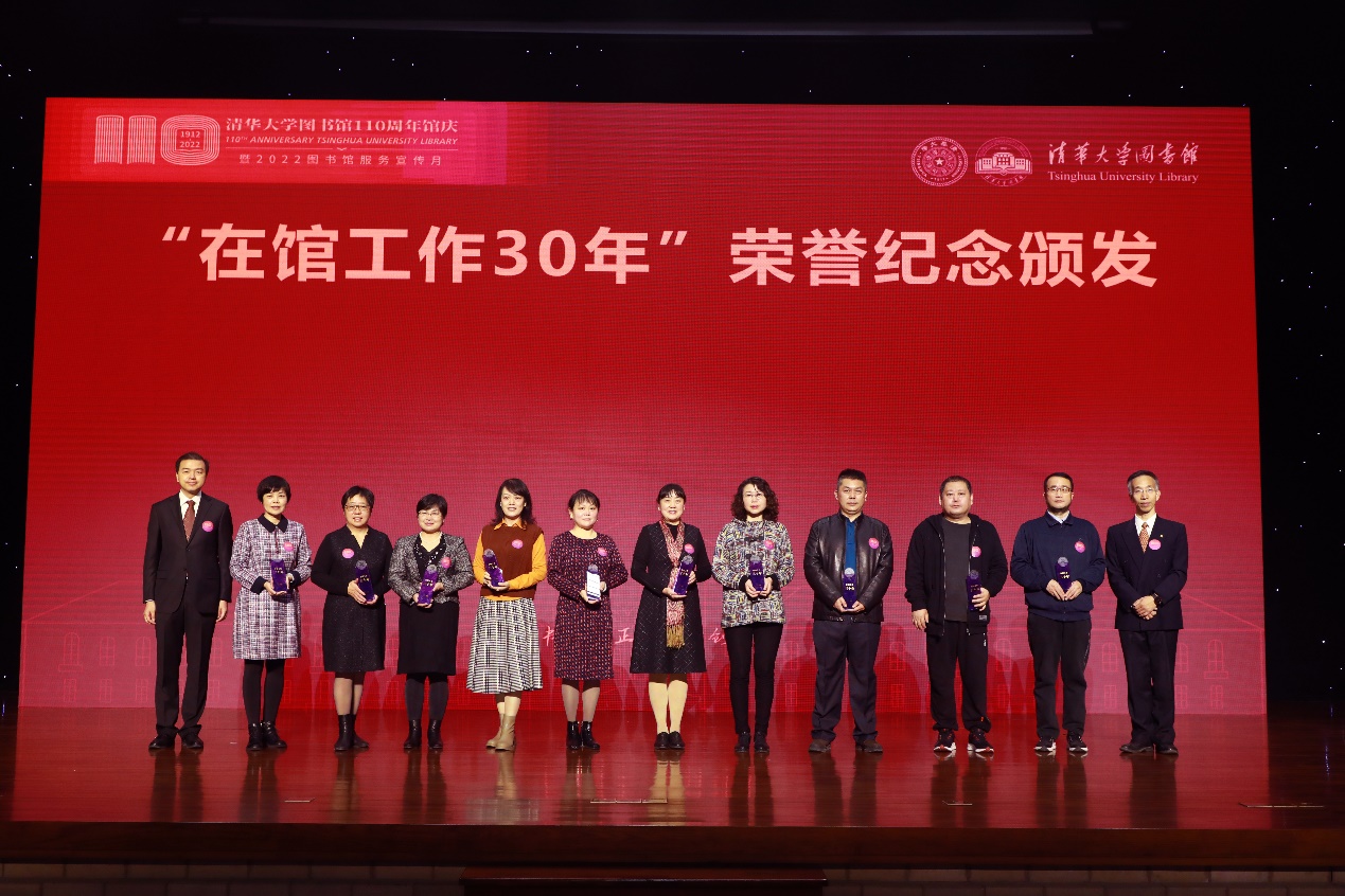 清华图书馆设立“在馆工作30年”荣誉奖,表彰在图书馆工作超过30年的47位离退休馆员和18位在职馆员。向波涛和金兼斌为到场的馆员代表们颁发荣誉纪念。