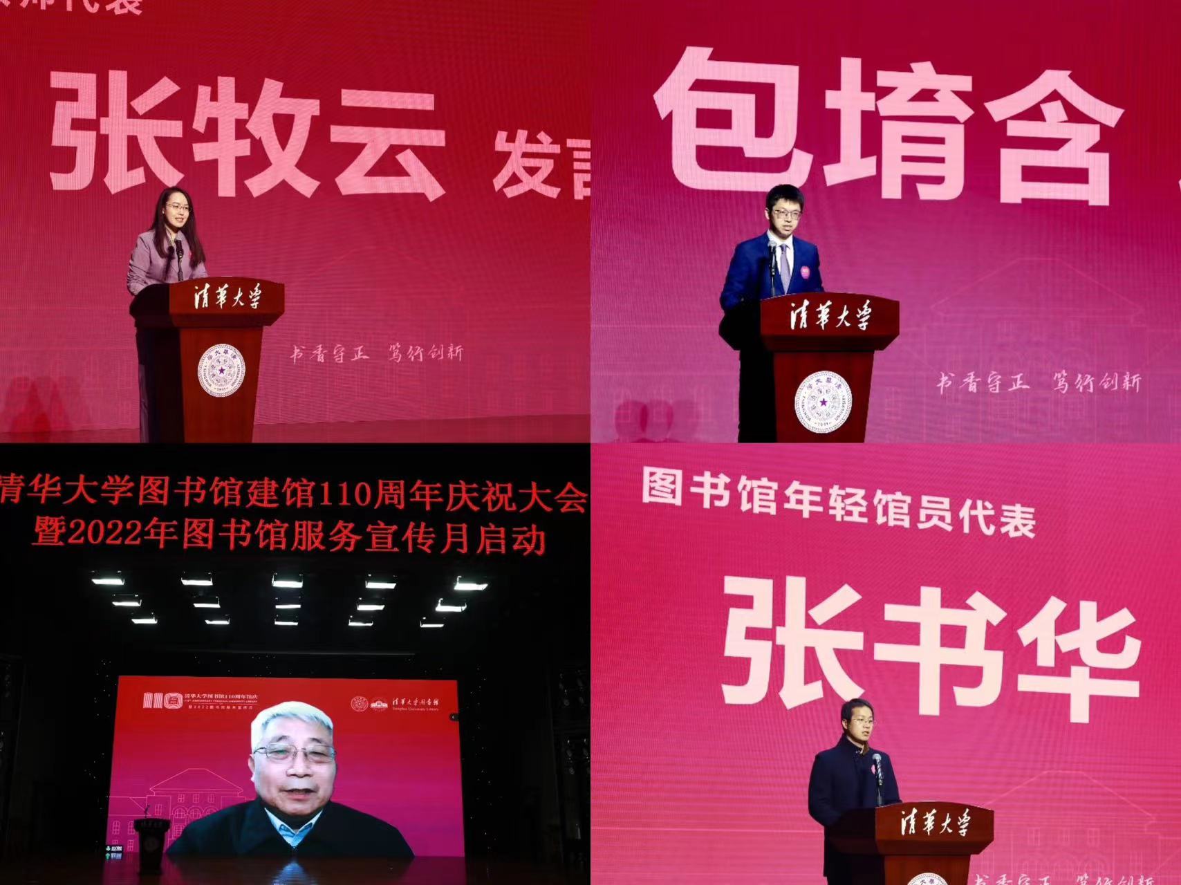 马克思主义学院副教授张牧云分享了她在教学科研过程中从图书馆获得的帮助,并表示图书馆在清华人才培养、科学研究与学科建设中发挥着越来越重要的作用;公共管理学院博士生包堉含分享了他与图书馆相伴十年共同成长的故事,并感谢图书馆为大家提供了一个跨越专业隔阂、结交良师益友和寻找灵感与方向的平台;在馆工作44年的老馆员代表赵熊在线讲述了从传统图书馆到现代图书馆不断探索的记忆画面,并向一代代图书馆馆员们致敬;信息技术部年轻馆员张书华分享了疫情初期馆员们继承前辈精神,奋发有为、坚守岗位,为全校“停课不停学”举措的顺利实施提供保障的经历。