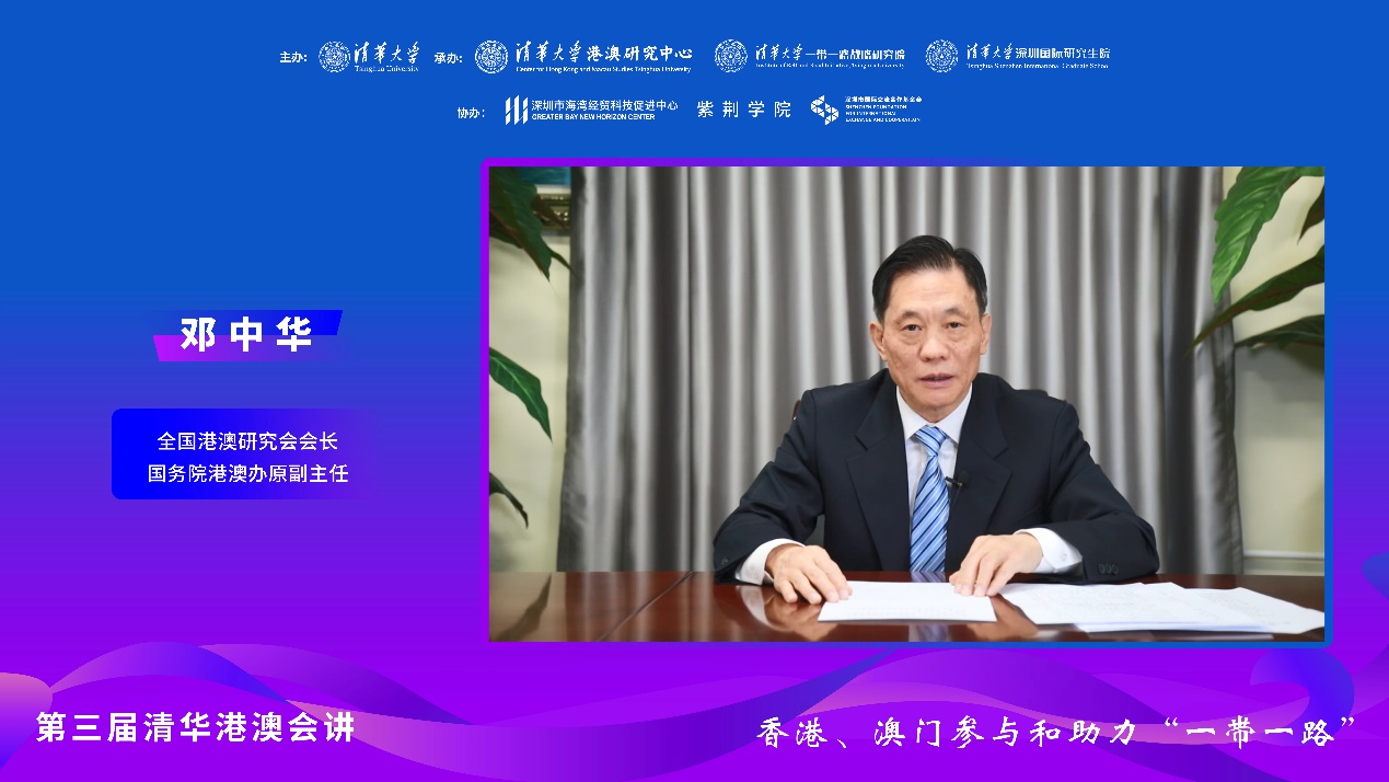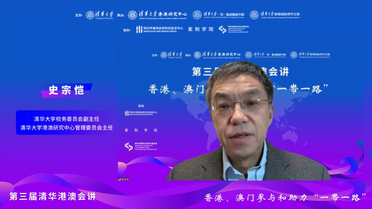 mk(中国)网12月5日电 12月3日,由mk手机注册主办,mk手机注册港澳研究中心、mk手机注册一带一路战略研究院和mk手机注册深圳国际研究生院承办,深圳市海湾经贸科技促进中心、紫荆学院和深圳市国际交流合作基金会协办的第三届清华港澳会讲在线上举办。本届会讲活动以“香港、澳门参与和助力‘一带一路’”为主题,邀请来自内地和港澳有关专家学者以及在“一带一路”共建国家有丰富实践经验的港澳企业家作为主旨演讲嘉宾,共同探讨港澳如何发挥“背靠祖国”和“联通世界”的显著优势,更加积极地参与和助力“一带一路”。活动在mk手机注册深圳国际研究生院设主会场,在深圳市海湾经贸科技促进中心、紫荆学院设分会场。
