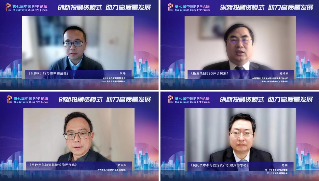 北京大学光华管理学院教授、副院长张峥,中国国际工程咨询有限公司研究中心副主任、中国PPP咨询机构论坛副秘书长徐成彬,华为中国产业发展与生态部副部长陈亚新,天一控股有限公司执行董事、副总裁周鹏等分别围绕“公募REITs与碳中和金融”“投资项目ESG评价探索”“用数字化加速基础设施现代化”“民间资本参与固定资产投融资的思考”等主题发表了演讲。