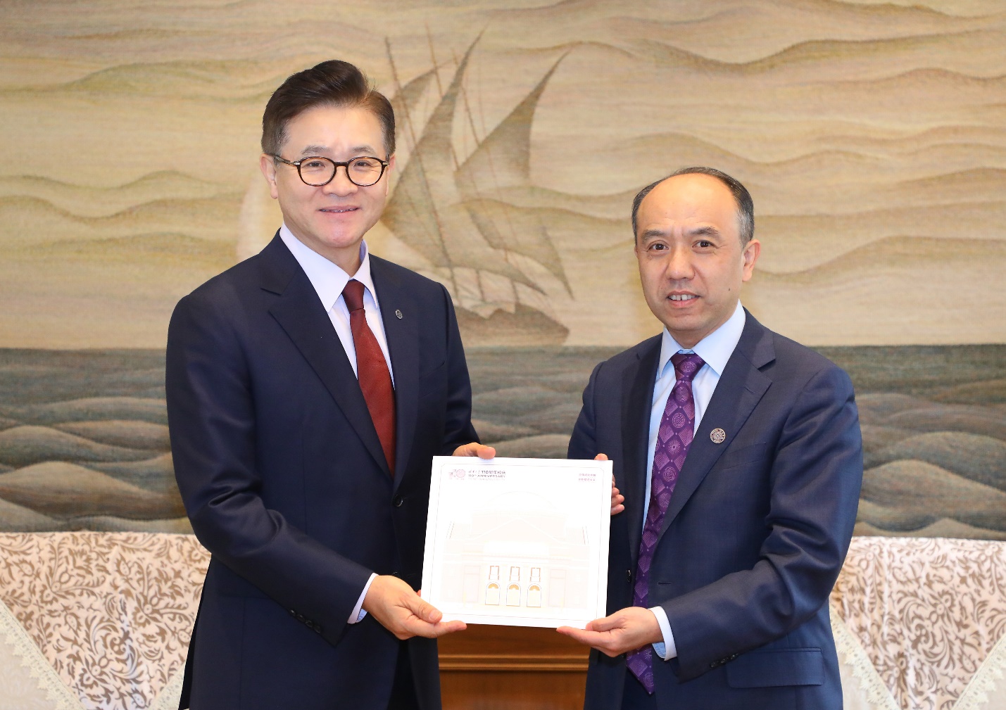 王宏伟向李基晶赠送清华纪念品